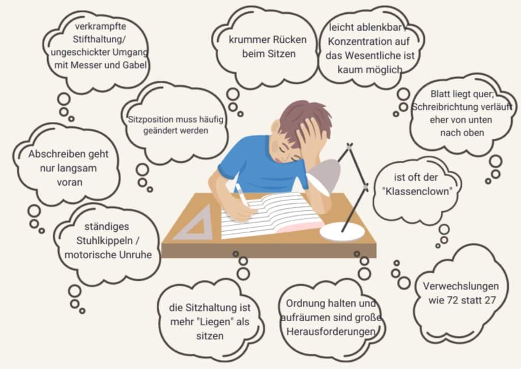 Lesen setzt die Entwicklung und Steuerung müheloser Augenbewegungen voraus, um aufeinander folgende Informationen in der richtigen Reihenfolge an das Gehirn zu senden. Neben den Augenbewegungen ist auch die Auge-Hand-Koordination eine motorische Fähigkeit, die z.B. für das Schreiben gut entwickelt sein muss. Still zu sitzen und Aufmerksamkeit zu entwickeln, setzen die selbstbestimmte Kontrolle des eigenen Körpers, Gleichgewicht und Orientierung voraus sowie die Einbindung der Bereiche der Großhirnrinde, die an der Aufrechterhaltung der Aufmerksamkeit beiteiligt sind. Wenn Kinder trotz regelmäßigen Übens und „herkömmlichen Unterrichts“ Schwierigkeiten haben, ihre Fähigkeit zum genauen und flüssigen Lesen und Rechtschreiben zu entwickeln und auszubauen, dann zeigt sich das möglicherweise in Merkmalen wie diesen: